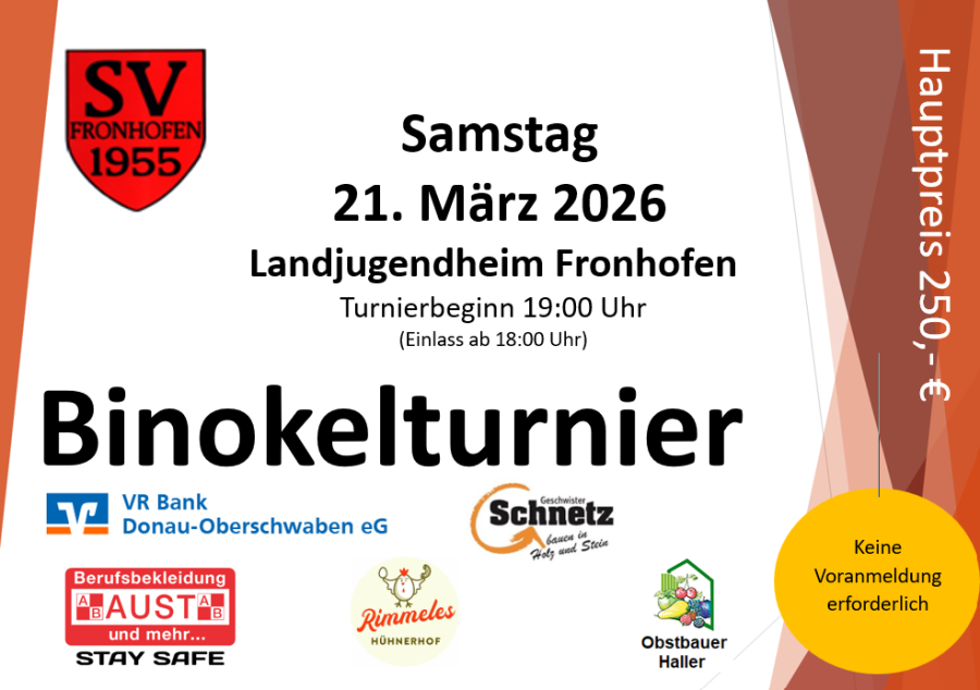 nach dem Turnier ist vor dem Turnier. Deshalb merkt euch bitte jetzt schon den Samstag 21.März 2026 vor. Hier findet unser nächstes Binokelturnier im Landjugendheim Fronhofen statt.